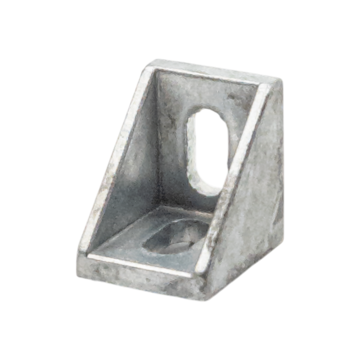 Small galvanized angle bracket, 17×20mm, natural finish. For lightweight right-angle connections.