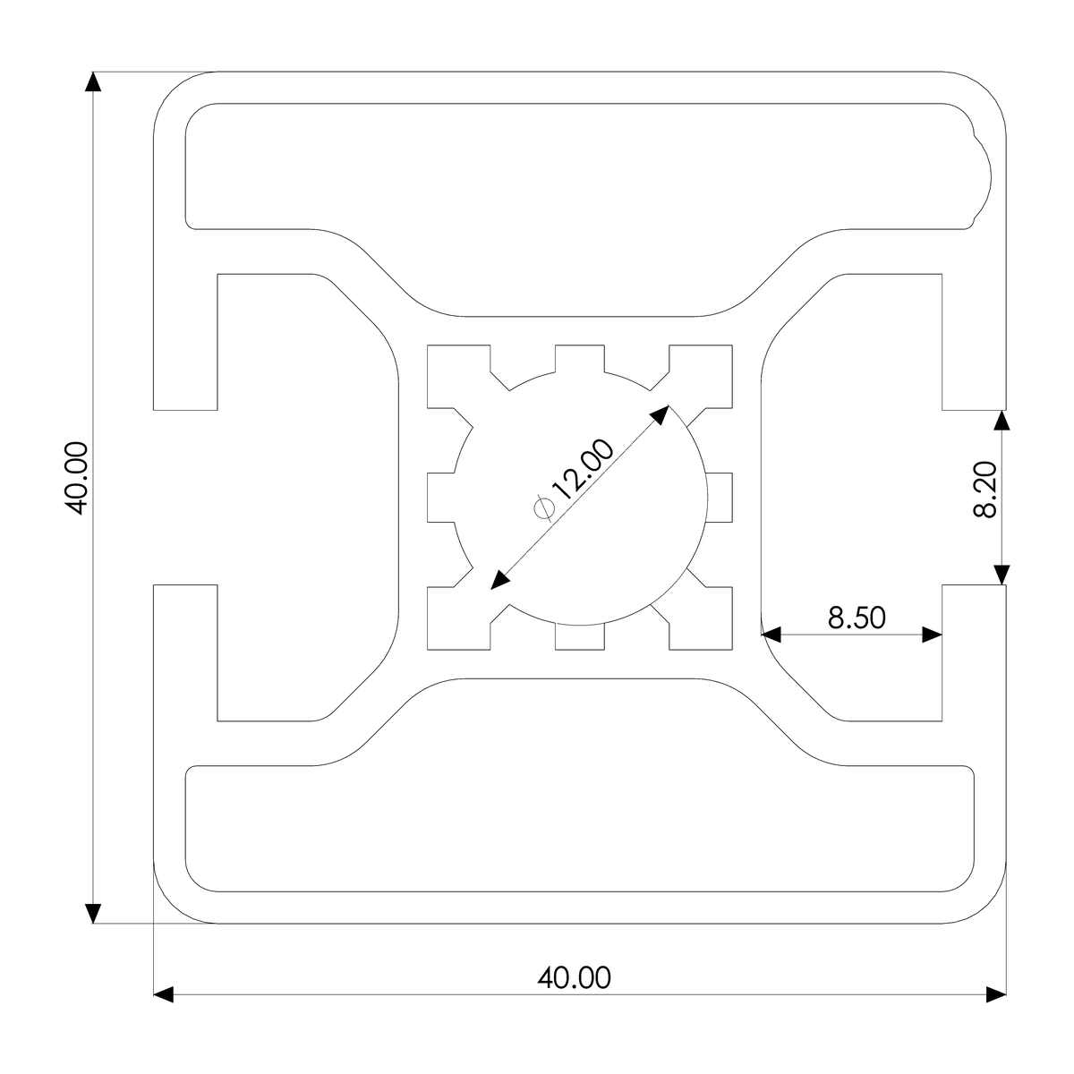 40x40 2E AcrossProfile Cross-Section · Click a side