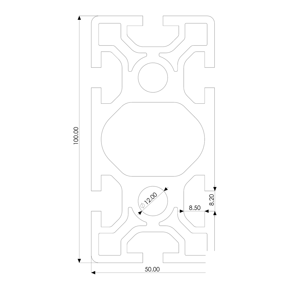Extremely robust profile optimized for rigidity, strength, versatility. Used in machine guarding applications, machine framing.