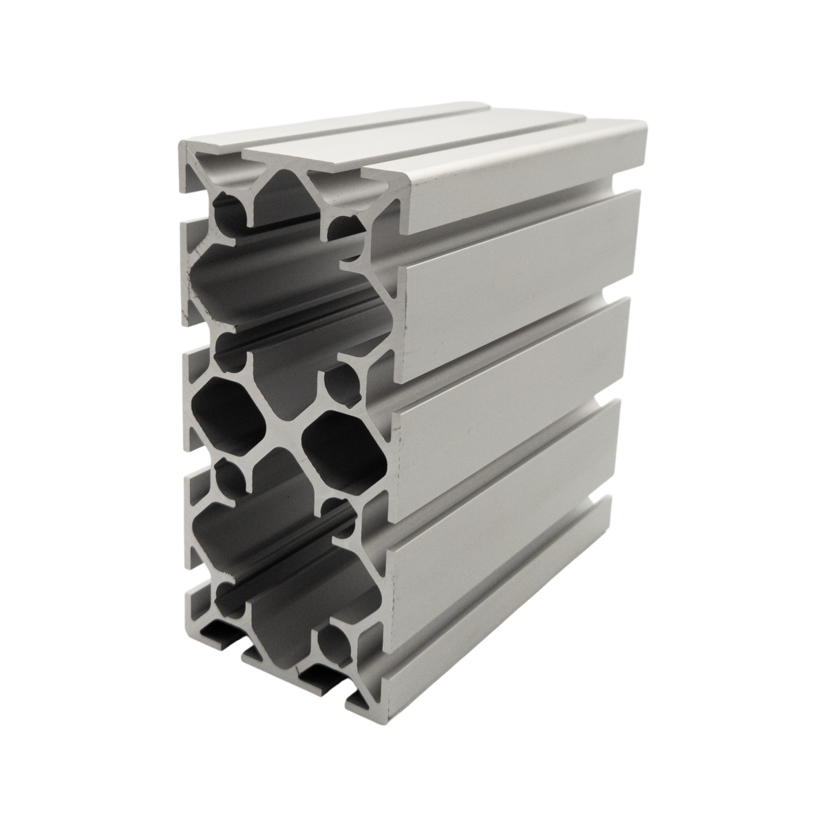 Extremely robust profile optimized for rigidity, strength, versatility. Used in heavy weight bearing machine guarding applications, heavy and rigid applications with vibration dampening and heavy rigidity requirements while still remaining modular and easy to assemble.
